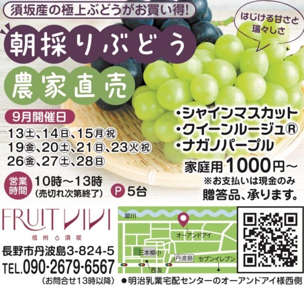 長野市丹波島で開催する出張直売所で朝採り新鮮なぶどうを販売するので
