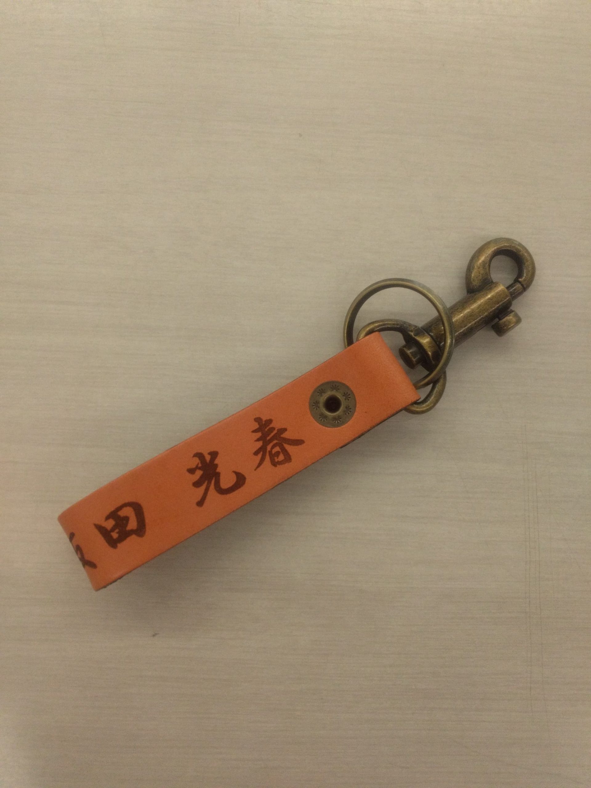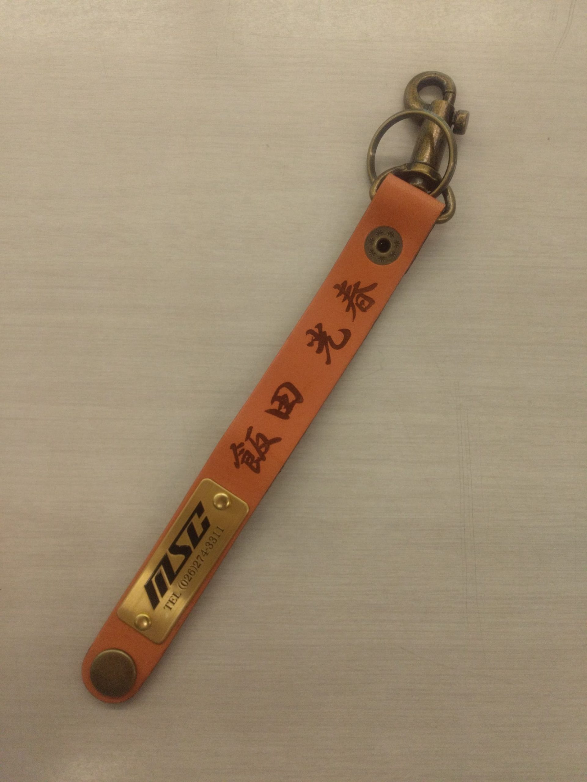 弊社社員自前のレザーキーホルダーに名前を彫刻してみました